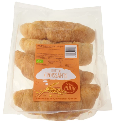 Croissants aus der Verpackung nehmen, den Backofen auf 200°C vorheizen, in etwa 6-8 Minuten genussfertig