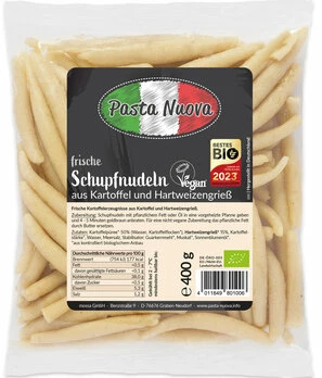 Pasta Nuova – Frische Pasta in bester Bio-Qualität Die Pasta Nuova GmbH stellt seit mittlerweile 30 Jahren frische Bio-Pasta nach original italienischen Familienrezepten her. 1990 gründete Leandro Mossa das Unternehmen, um auch in Deutschland in den Genuss der guten Pasta seiner sardischen Heimat zu kommen. Sein Sohn Claudio stieg nach wenigen Jahren mit in den Betrieb ein, dem er als Geschäftsführer voransteht. Mittlerweile arbeitet bereits die dritte Generation im Betrieb und auch in Zukunft wird die Pasta Nuova GmbH ein reines Familienunternehmen bleiben. Alle Produktionsschritte bis hin zum Versand finden am Firmenstandort in Graben-Neudorf und im benachbarten Waghäusel-Kirrlach statt. Strom wird aus der eigenen Photovoltaik-Anlage gewonnen, der zusätzliche Bedarf wird durch Ökostrom abgedeckt. Die Rohstoffe werden so regional wie möglich bezogen. Das Sortiment umfasst insgesamt 20 Sorten frischer Pasta, darunter italienische Spezialitäten wie Tortelloni, Ravioli, Mezzelune und Gnocchi. Aber auch die süddeutschen Klassiker Maultaschen, Schupfnudeln und Spätzle haben bei Pasta Nuova ihren festen Platz. Im Betrieb werden weder Fleisch noch Fisch verarbeitet. Neben zahlreichen veganen Produkten bietet Pasta Nuova auch glutenfreie Gnocchi an. Verschaffen Sie sich selbst einen Überblick über das vielfältige Sortiment! |
