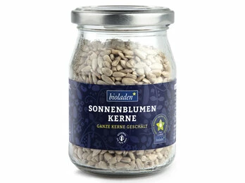 Die bioladen*Sonnenblumenkerne im Mehrwegglas. Die Sonnenblumenkerne eignen sich als Topping für Salate und Suppen, können für Müslis oder zum Backen verwendet werden.